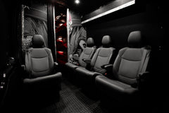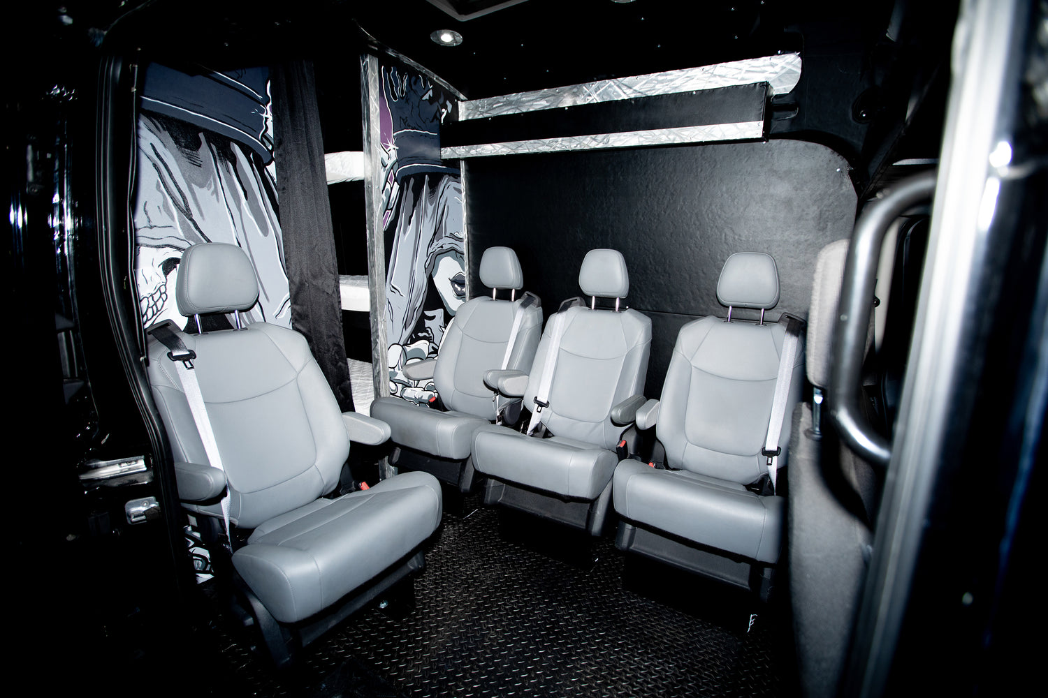 Go on a midnight adventure in style with the alternative style Stagecoach touring van. This van encompasses 6 seats and 6 bunks with a curtain for privacy.